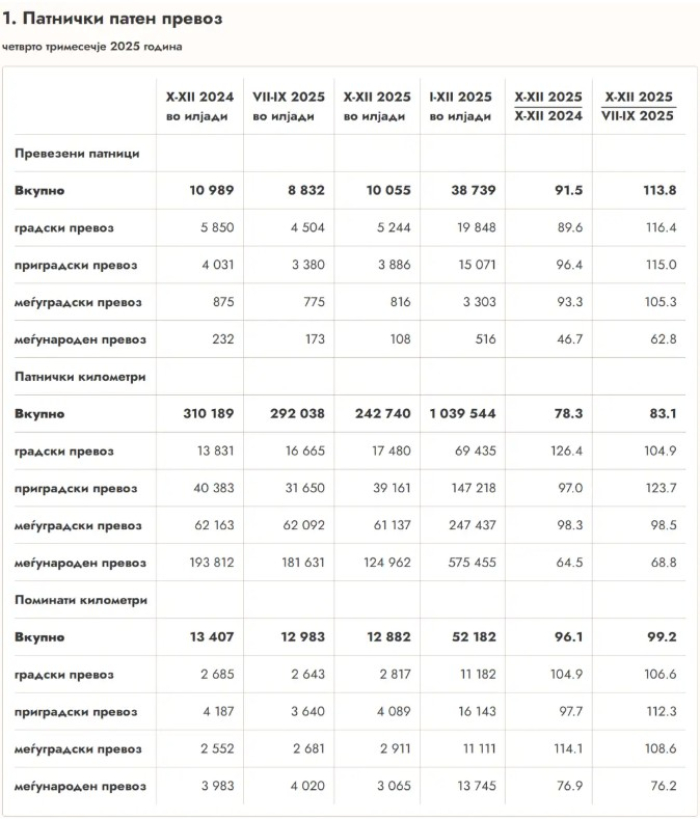 Во четвртото тримесечје од 2025 година, вкупниот број на превезените патници во патничкиот патен превоз изнесува 10.055.000 и е намален за 8.5 проценти во однос на четвртото тримесечје од 2024 година, објави денеска Државниот завод за статистика.