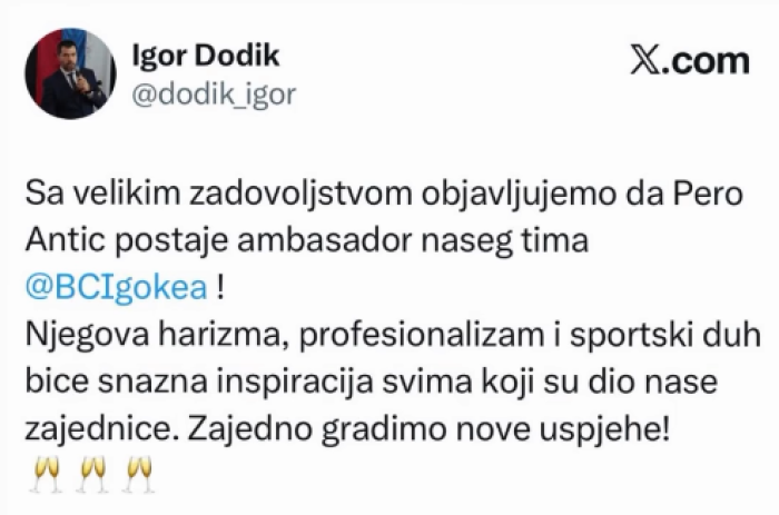 „Со големо задоволство објавуваме дека Перо Антиќ станува амбасадор на нашиот тим. Неговата харизма, професионализам и спортски дух ќе бидат силна инспирација за сите кои се дел од нашата заедница. Заедно градиме нови успеси“, објави генералниот менаџер на клубот, Игор Додик.