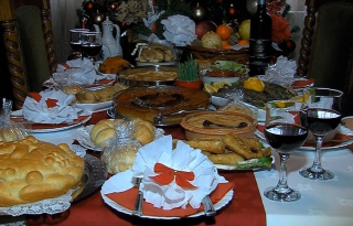 Посна трпеза, мрсни цени за Бадниковата вечер. Се меси или купува лебче или пита со паричка, риба, гравче, посни сарми, маслинки, урми, ореви,...