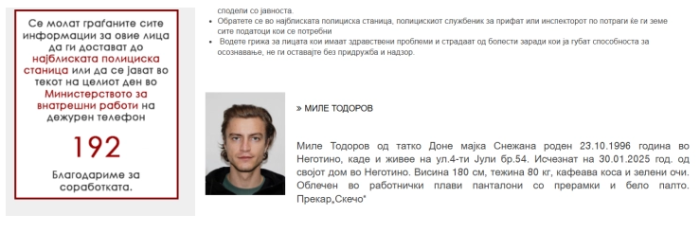 Да не се заборави случајот со исчезнатиот Миле Тодоров, млад жител на Неготино, кој исчезна пред точно два месеца, бараат неготинци на социјалните мрежи.