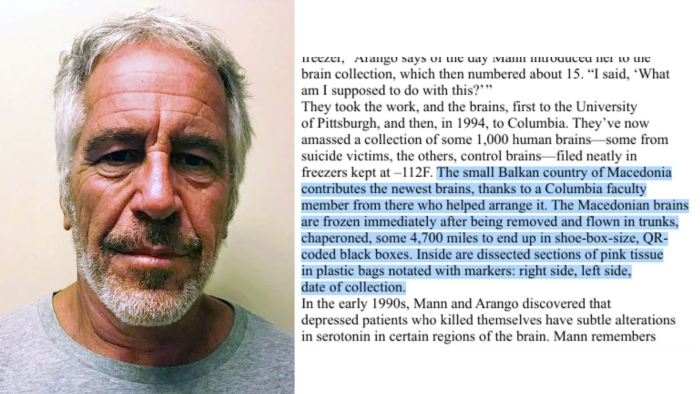 Јавното обвинителство на Република Северна Македонија, врз основа на повеќе објавени информации во медиумите, оформи предмет по допрен глас поради наводите од објавените документи во случајот за Џефри Епштајн кои упатуваат дека примероци од мозоци на починати лица од земјава наводно биле транспортирани за научно-истражувачки цели во САД.