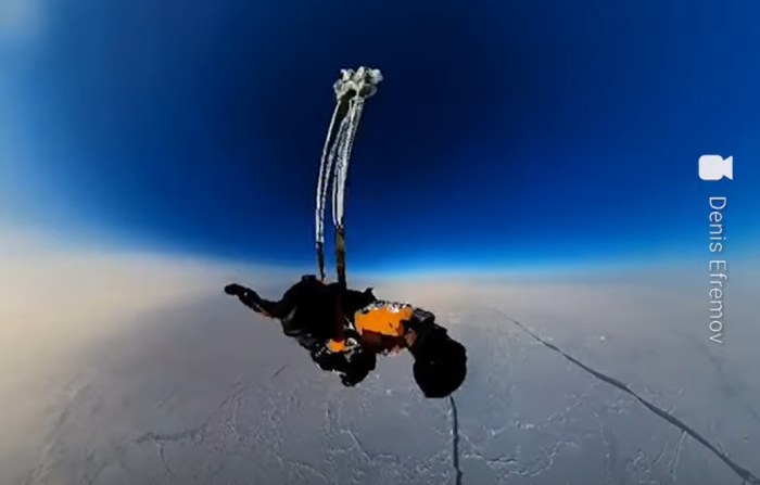 Падобранците Михаил Корниенко, Александар Линик и Денис Јефремов скокнаа од авион „Иљушин-76“ на височина од 10.500 метри и слободно паѓаа две и пол минути пред да ги отворат своите падобрани на 1.000 метри од земјата. Сите тројца падобранци паѓаа со брзина од повеќе од 300 километри на час, на температура некаде и околу -50 Целзиусови степени, според Цаплин.