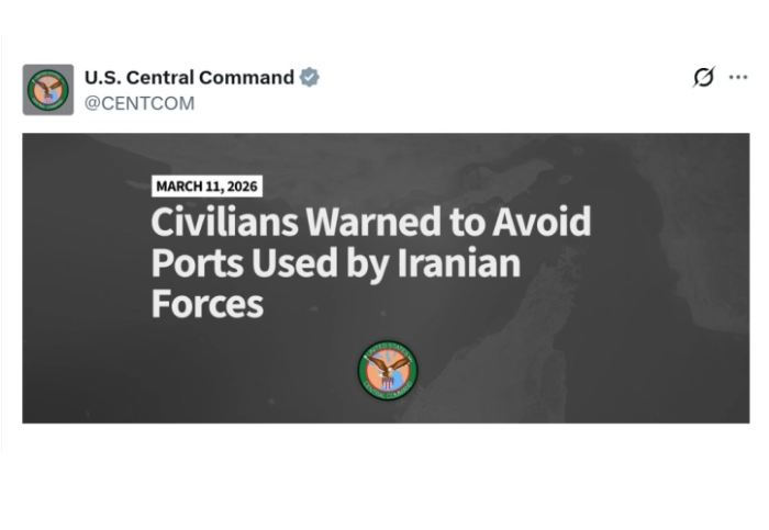 Централната команда на САД (Центком) ги предупреди цивилите во Иран „веднаш да ги избегнуваат“ сите пристаништа долж Ормускиот теснец каде што оперираат иранските поморски сили.