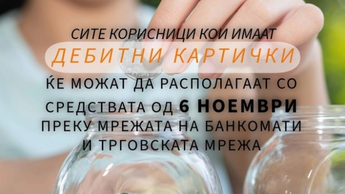 -Корисниците на парични права коишто поседуваат дебитна картичка ќе можат од денеска (6 ноември) да подигнат готовина на банкоматите на банките, да ги користат средствата за безготовински плаќања во продажната мрежа или преку електронско и мобилно банкарство, велат од Министерството.